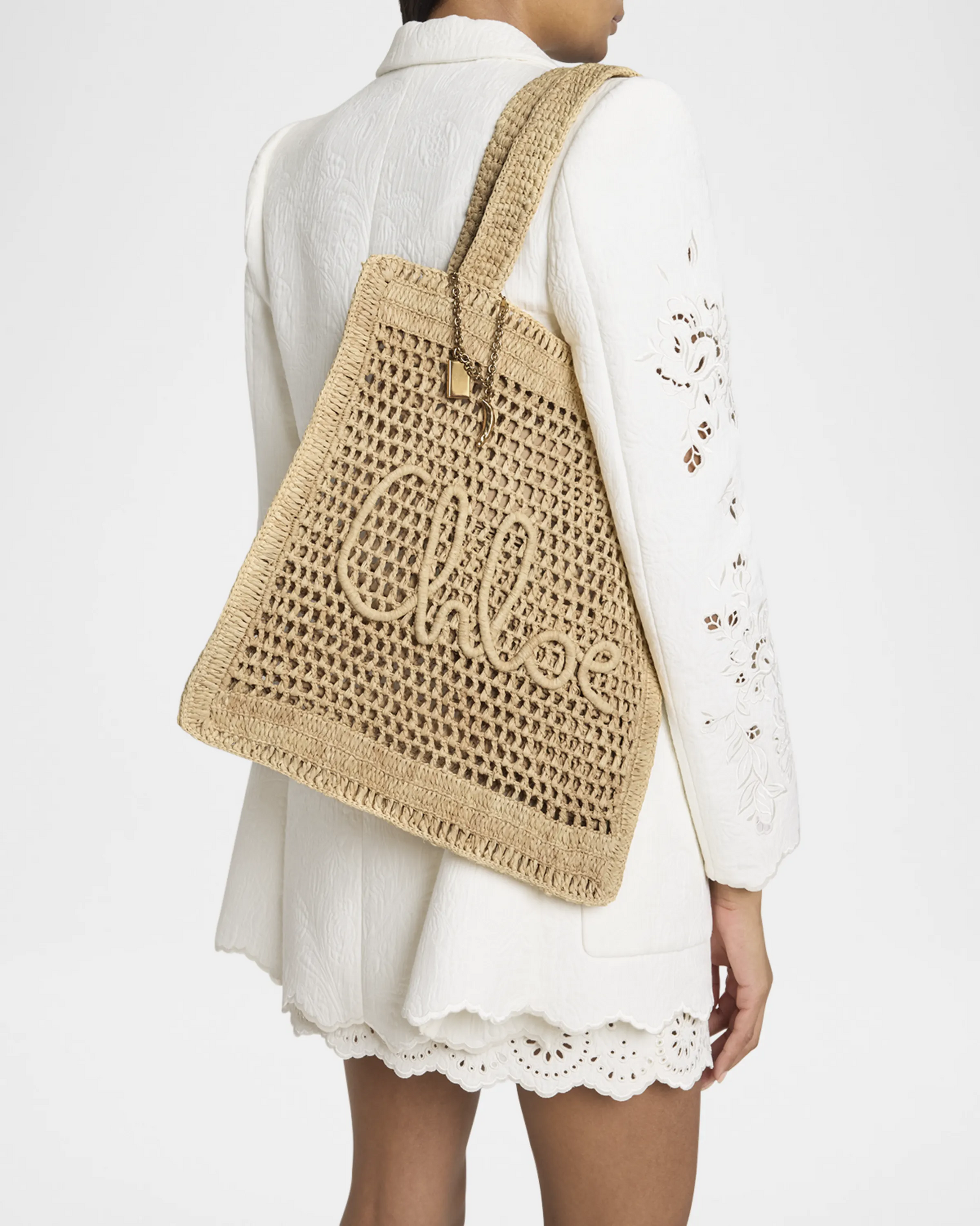 - Chloé's "Summer" tote bag, crafted from raffia-like crochet fabric, features a playful banana chain charm and tonal logo lettering