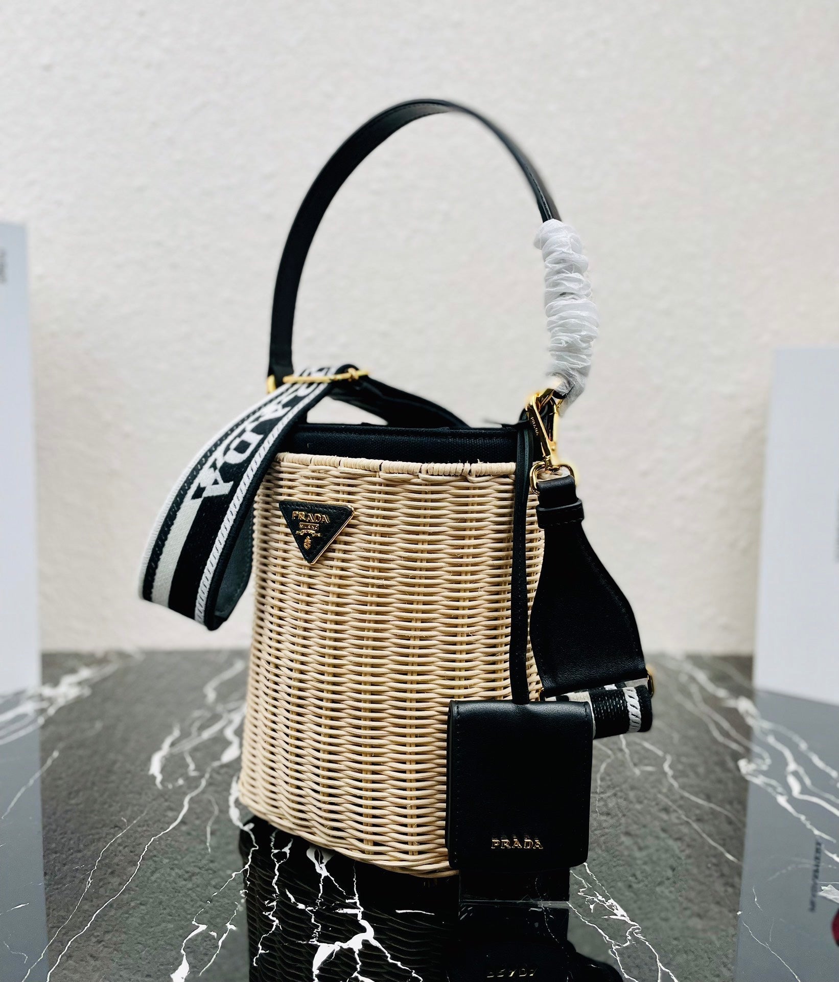Prada Wicker And Canvas Bucket Bag TanBlack size 18x19x11 cm